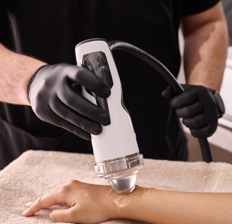 - Treatment Application – A gel is applied to the skin and the handheld shockwave device directs pulses to the targeted area.